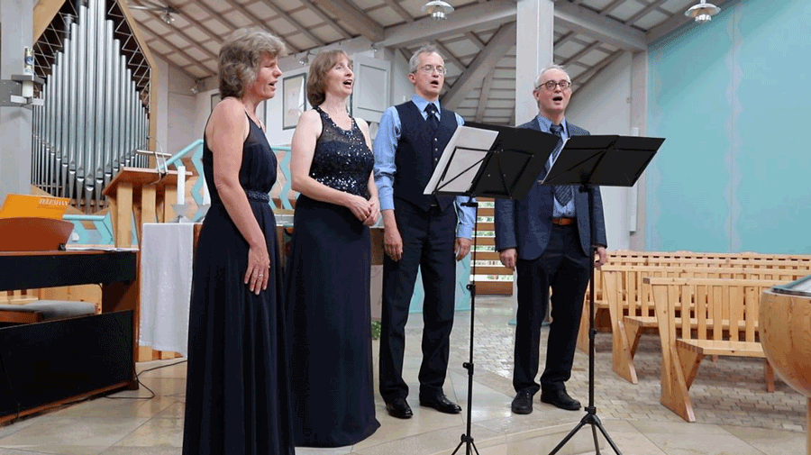 In der Friedenskirche waren schon oft Gesangsdarbietungen zu hören. Bei "Voci per sonare" waren es jedoch nur 4 Stimmen, die die "blaue Kirche" nicht laut aber intensiv mit ihren Stimmen a capella oder mit Gitarren- und Klavierbegleitung